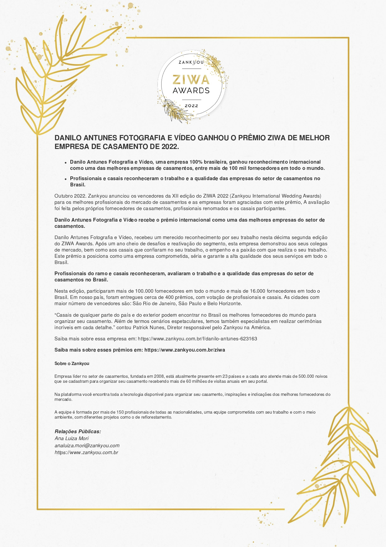 Outubro 2022. Zankyou anunciou os vencedores da XII edição do ZIWA 2022 (Zankyou International Wedding Awards) para os melhores profissionais do mercado de casamentos e as empresas foram agraciadas com este prêmio, A avaliação foi feita pelos próprios fornecedores de casamentos, profissionais renomados e os casais participantes.